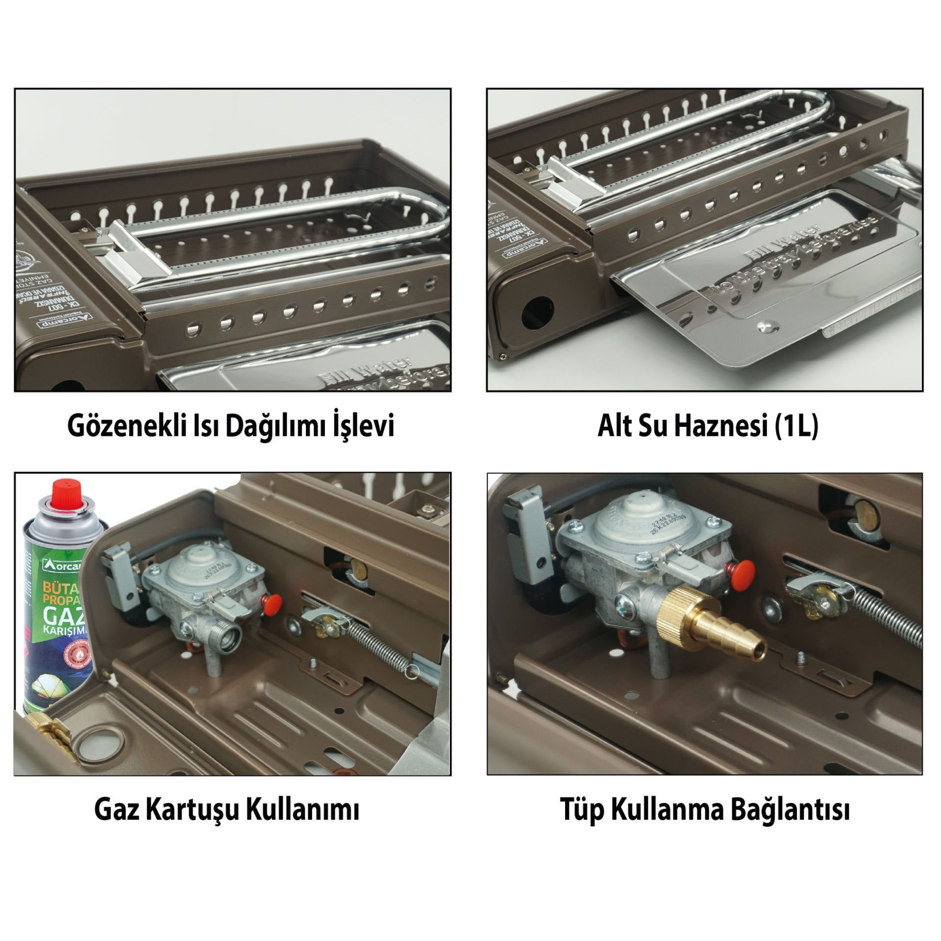 Üçü bir arada piknik tüpleri veya 227 gram gaz kartuşları ile kullanılabilir. Tüp hortumlarına uyumlu aparat parçasını kullanarak tüp bağlantısını gerçekleştirebilirsiniz. Çift seçenekli yakıt opsiyonu sunar. Teflon tava, paslanmaz ızgara, yemek pişirme sacı gibi kombine bir paket sunar. Izgara yüzeyi normal ızgaralardan iki kat daha geniştir. Toksin ve duman yoktur; çevre ve sağlık için %100 güvenlidir. Izgara yüzeyi 304 paslanmaz çelik kalitesinden yapılmıştır.